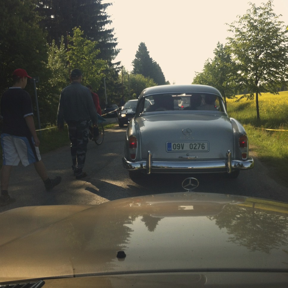 Tyto a mnohé jiné otázky mi přestaly mást hlavu v okamžiku, kdy jsme se na cestu do Křenovic někdy kolem osmé (!!!) ráno seřadili na benzínce v Hluboké nad Vltavou do čtyřčlenného průvodu kabrioletů a vydali se na cestu. Už tento zážitek by mi na celý den a další rok stačil. Klikatili jsme se Golf 1,9 GTI Cabrio, pak má Alfa Romeo Spider 2,0 (gumák) za mnou Davidova BMW Alpina Baur (E21) a nakonec Mercedes Benz 380 SL (R 109). Pokoušel jsem se zjev filmovat a málem párkrát zrušil formaci i mé auto, nicméně v této disciplíně mám ještě co dohánět. Video s takovou lahůdkou vám naservíruju někdy příště.