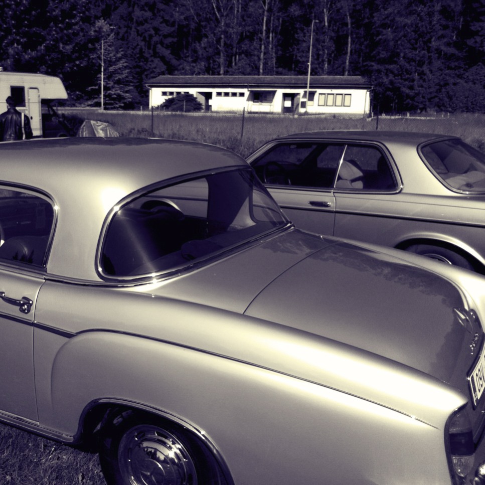 Hezké bylo také neplánované mezigenerační setkání kupé páně Daimlera a Benze, konkrétně W 180 (Ponton, 220S) a mého Goldieho. Pontona jsem potkal těsně před vjezdem do areálu a už se jej nepustil, takže jsem mohl zaparkovat vedle něj.
