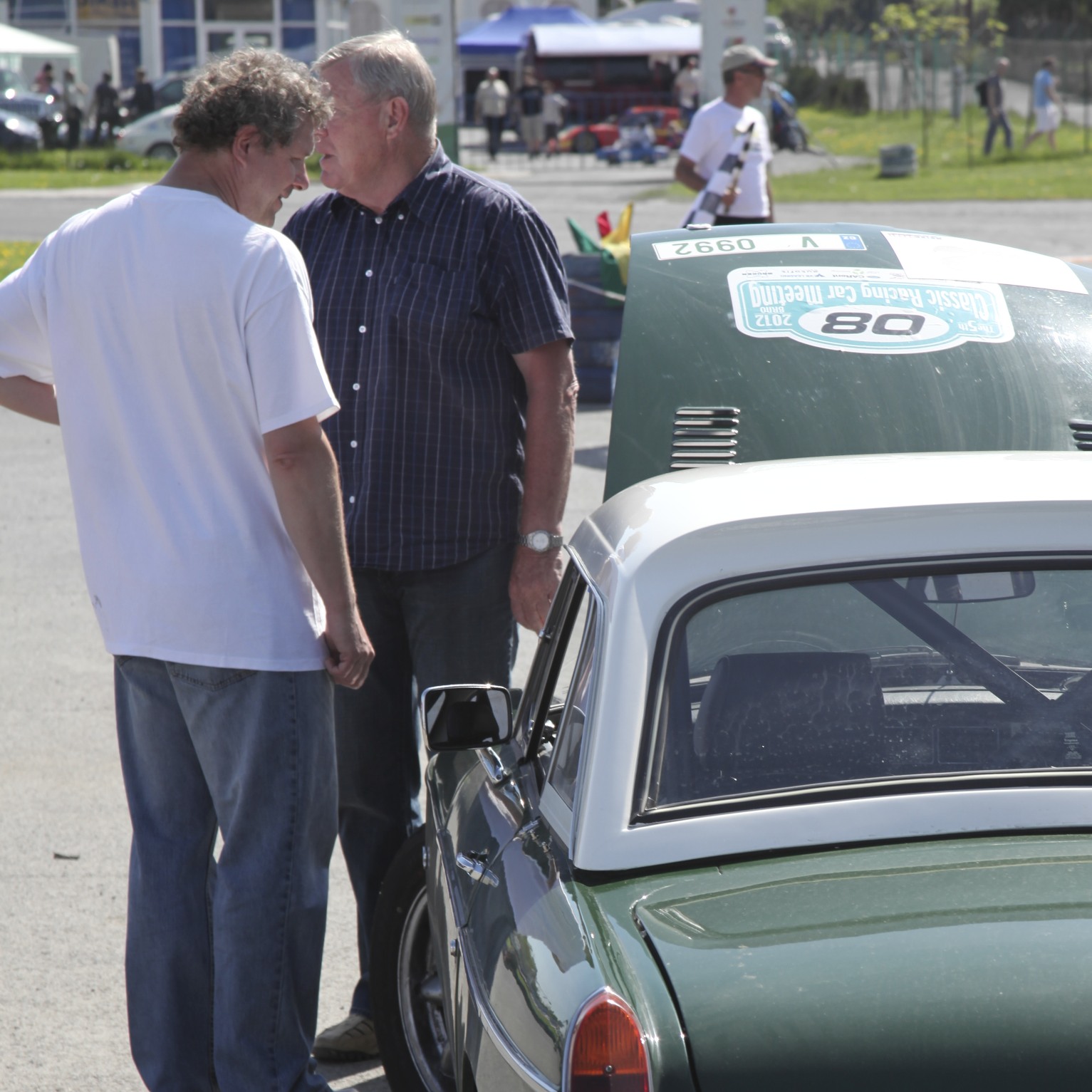Na místě srazu již pár prvních srazantů bylo, takže jsme měli co okukovat krátce po registraci, úvodní fotografii na památku (fotku mě v autě jsem do té doby neměl!) a povinné klobáse. Jaká všechna auta byla k vidění je asi blbé popisovat, když se můžete podívat na stránkách klubu. Důležité pro nás bylo, že dorazili i naši pražští vyznavači pikniků v jejich MG B napíglovaném jak se patří. Parta byla kompletní.